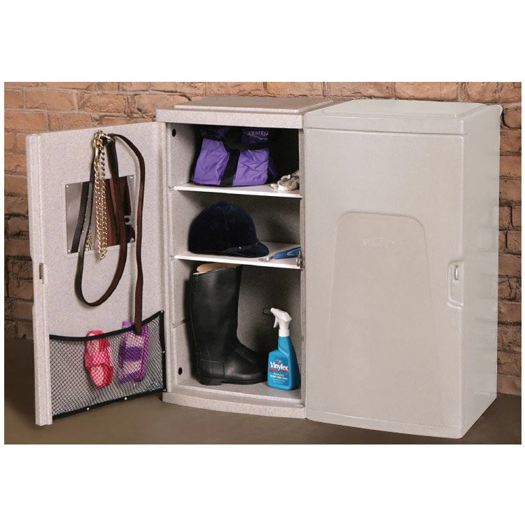 Burlingham Sports Equi-Locker. Lock-up your medicines, boots, helmets, shoes or any of your personal items. Each Locker includes two adjustable shelves, a hook to hang items, storage net for soft goods and a mirror for last minute touch-ups. The Equi-Locker can stand alone or hang on the wall. Organize your barn and boarders with this convenient stackable system that can mount together for a cohesive look in the tack room!