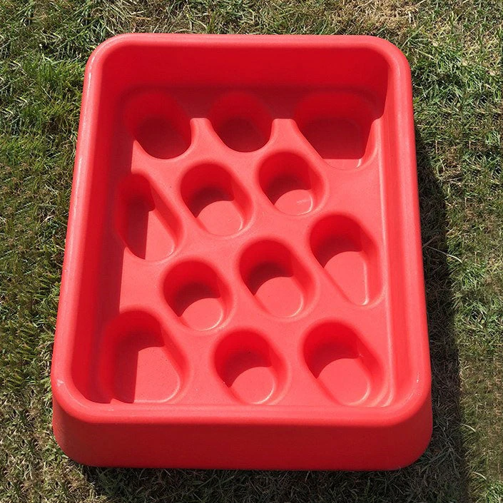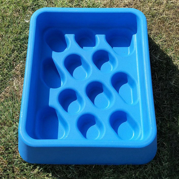 The Burlingham Sports Grad-Dual Feeder is a fun way to slow down your horse’s grain eating while keeping him mentally stimulated! Allows a natural eating position which prevents scarfing and gulping. The 12 feeding basins are 2″ deep and can hold up to 2 large scoops of feed. Suitable for wet or dry feed. The Grad-Dual Feeder is made from tough polyethylene that can be used indoors or outdoors.
