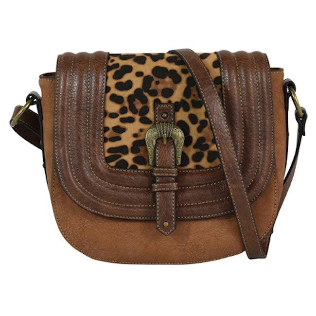 The Cheetah Print Crossbody Saddle Bag Style adds a funky western style to your outfit! This crossbody bag is in a brown leather with a top flap cheetah print accent. With one main interior compartment, two organizational pockets, one zip pocket and exterior slip pocket. This bag is finished with a snap closure under the printed flap and a brown leather adjustable strap.