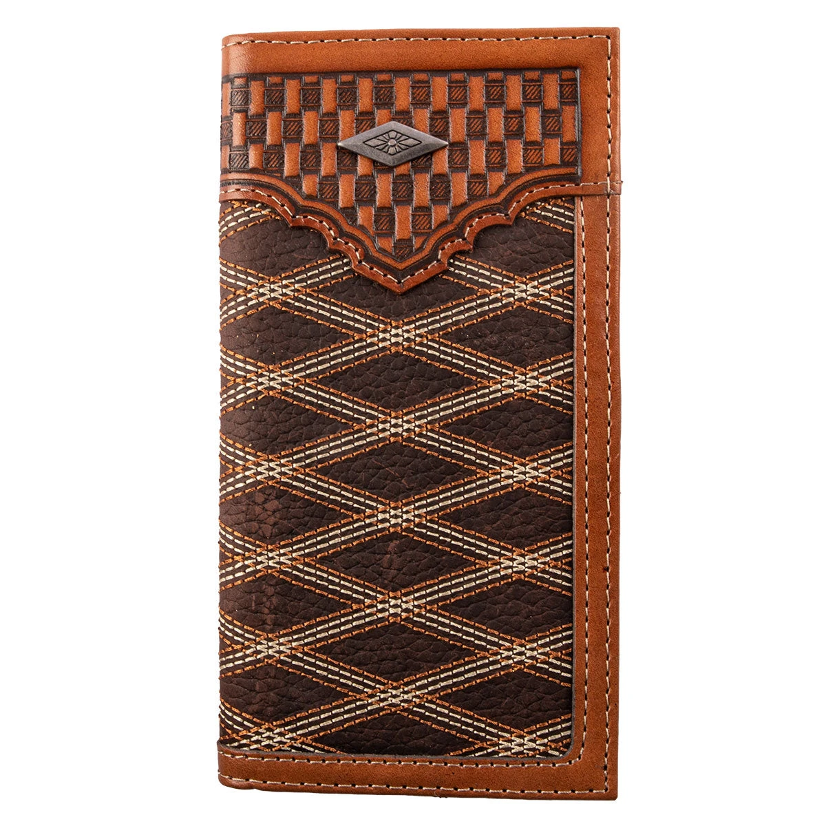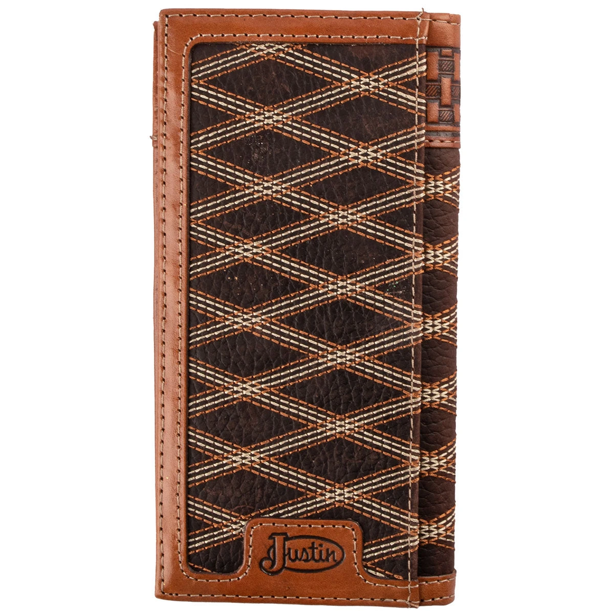 The Justin Rodeo Mens Wallet- Crisscross Stitch features a dark brown leather with crisscross embroidery stitch, basketweave yoke and front facing concho. On the interior there are 5 open slot pockets, 5 credit card slots, and 1 license holder.