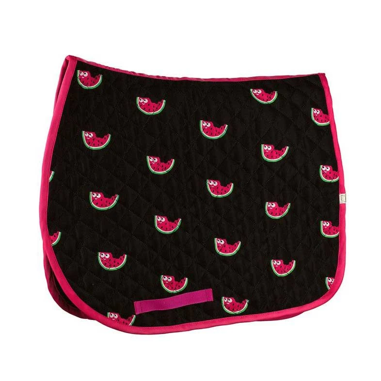 Bring some fun to the tack room with the Lettia Collection Watermelon Print Baby Pad! Featuring a black saddle pad with pink trim and watermelon accents. Includes girth straps to secure your saddle pad in place with the saddle. Slightly shaped spine to fit the horse’s back.
